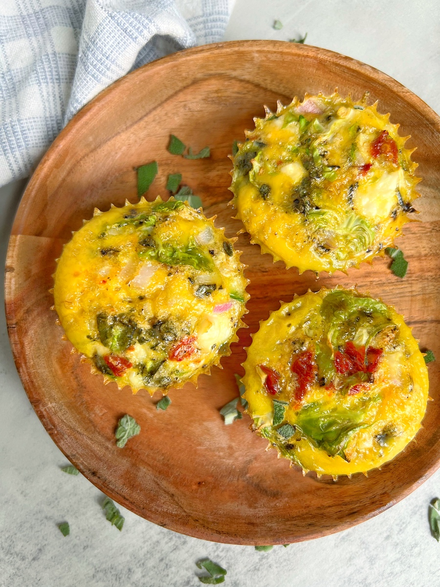 - Distribute all vegetables, sage, and feta evenly throughout all muffin cups